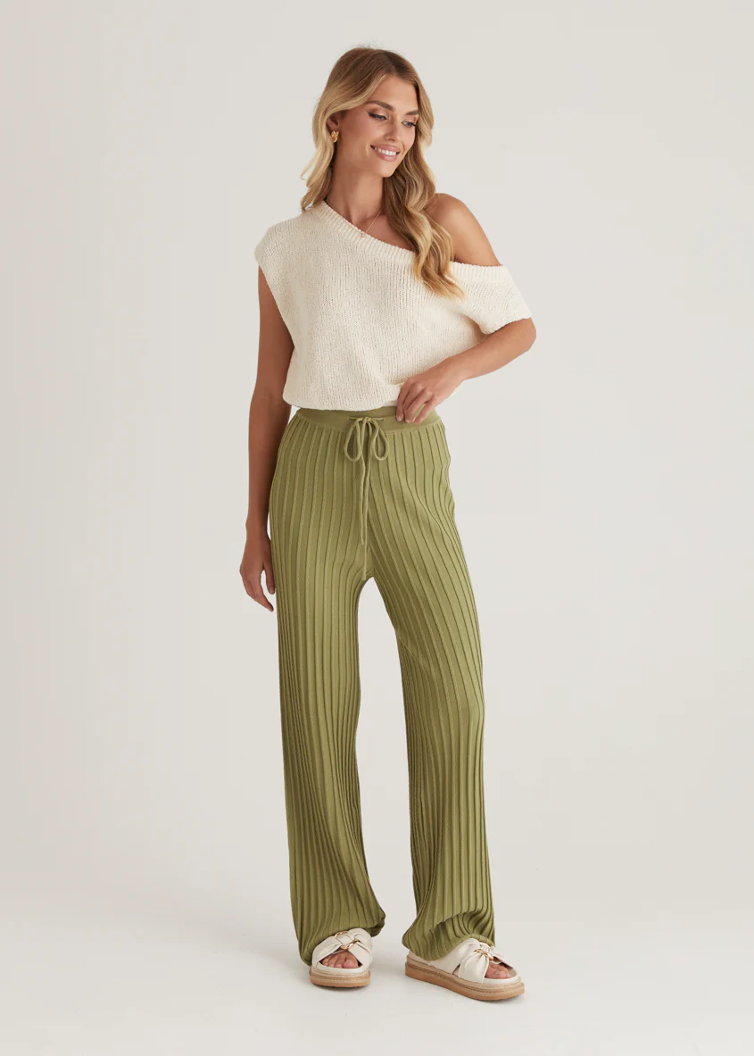Slip into something comfy yet elevated with the Etra Knit Pants in Olive – a relaxed staple with a luxe twist. Style yours with a fitted tank and slides for everyday ease, or dress it up with the matching knit top and heeled mules.