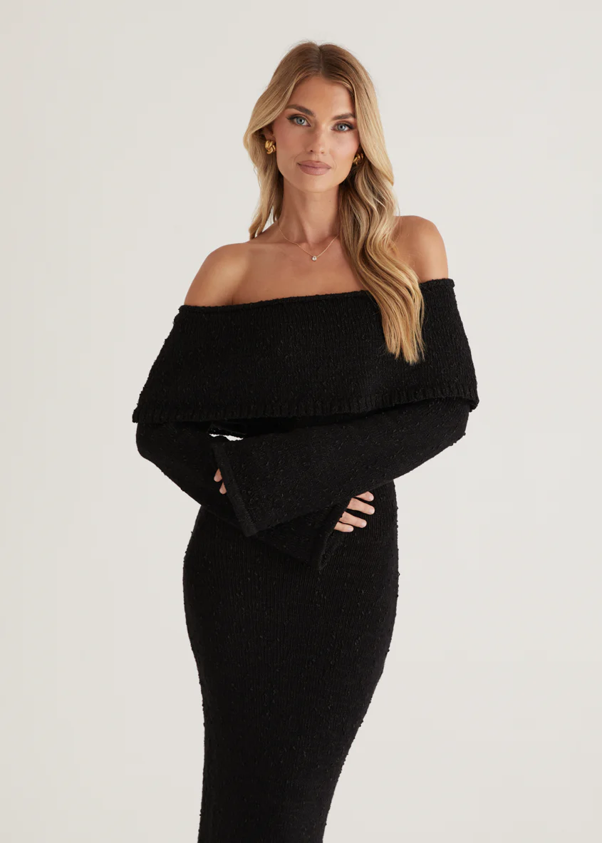 Sky Off Shoulder Knit Midi Dress - Black