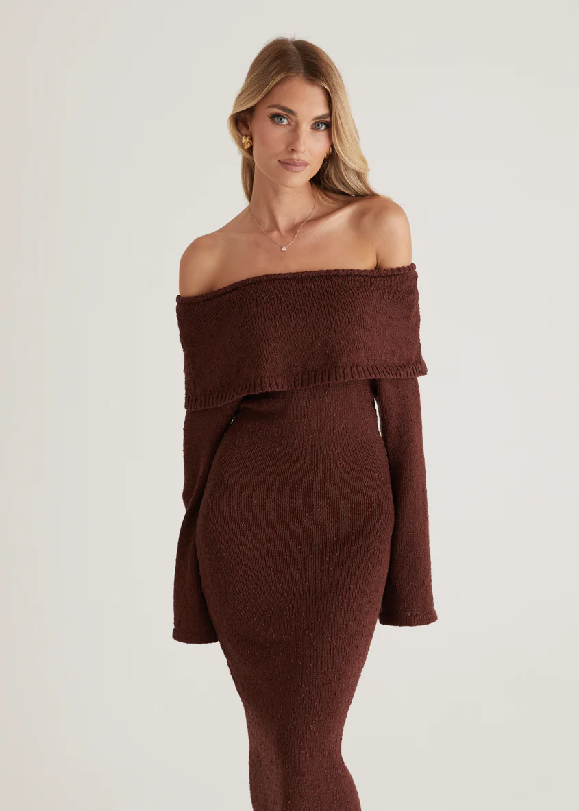 Sky Off Shoulder Knit Midi Dress - Chocolate